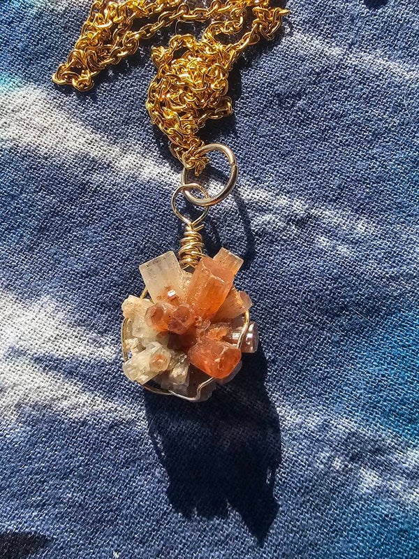 Aragonite Crystal Cluster wire wrapped, handmade pendant. This aragonite cluster was carefully wrapped in gold non-tarnishing wire.